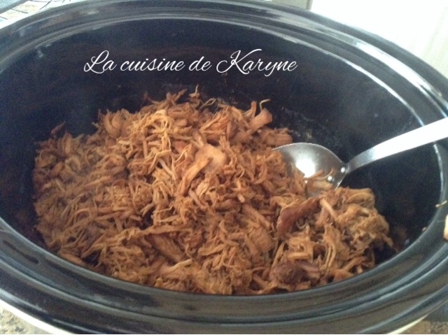 - Retirer le porc de la mijoteuse, l'effilocher grossièrement et réserver.
